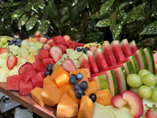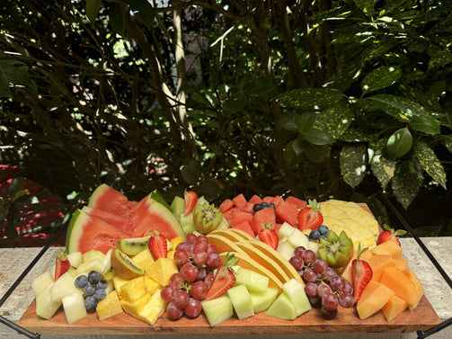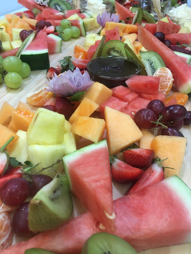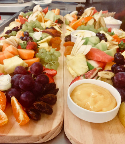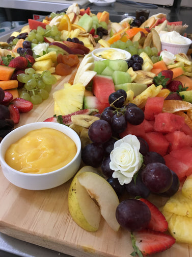 With a selection of seasonal fruits, Lemon curd from The Sassafras Providore kitchen, double whipped cream and chocolate dipping sauce